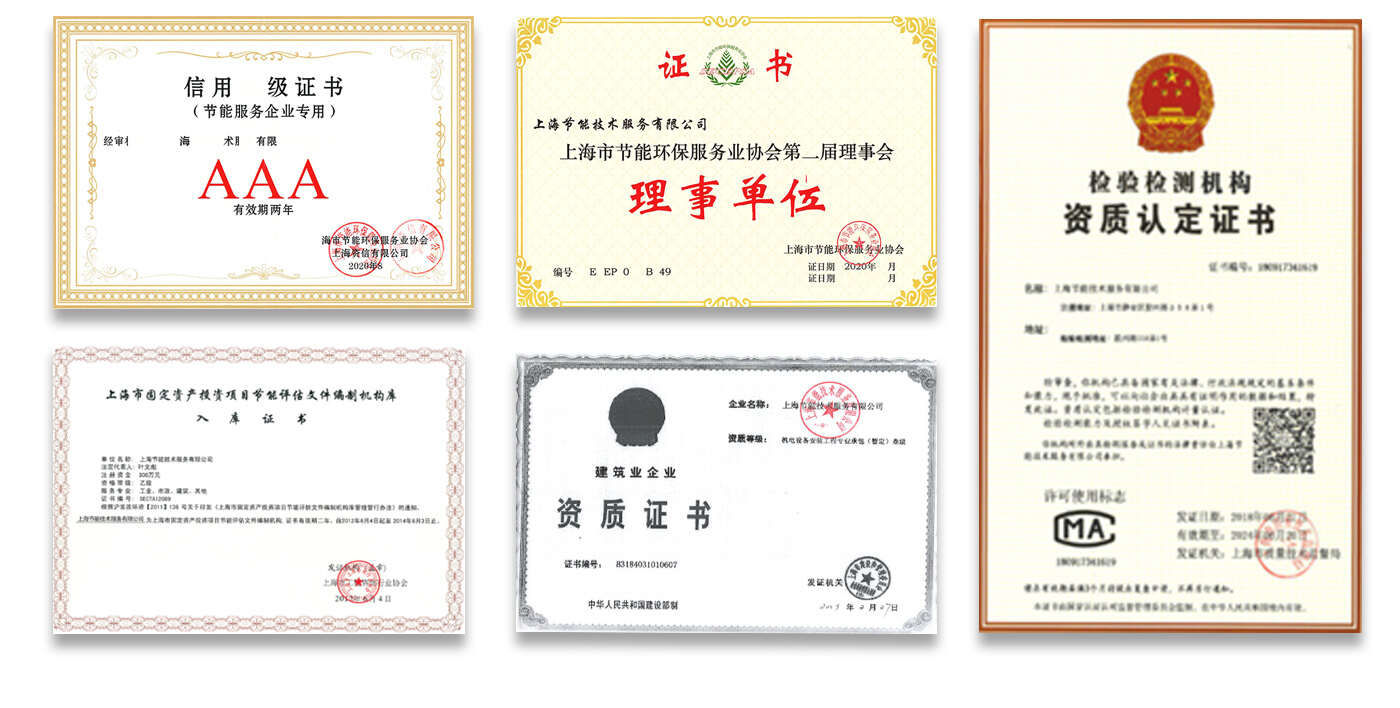 計量認(rèn)證證書、上海市固定資產(chǎn)投資項目節(jié)能評估文件編制機(jī)構(gòu)庫入庫證書、上海市節(jié)能服務(wù)機(jī)構(gòu)備案證書、上海市清潔生產(chǎn)審核機(jī)構(gòu)、信用等級證書(AAA)、上海市節(jié)能環(huán)保服務(wù)業(yè)協(xié)會理事單位